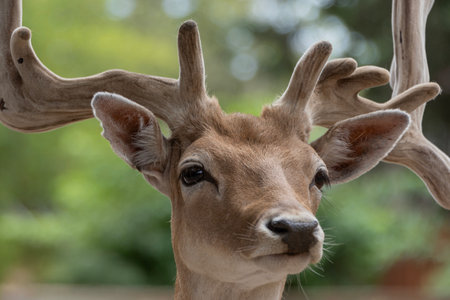 This captivating close-up of a deer showcases its striking features amidst a serene forest backdrop. The gentle gaze and impressive antlers invite viewers into the tranquil beauty of wildlife.