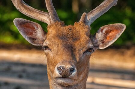 close-up of deer. Roe deer looking directly into the chamber with small horns in the forest sunlit.