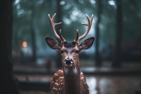 Close-up of a majestic deer with antlers in a tranquil forest during the early morning