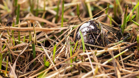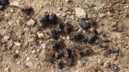 Close-up of animal droppings on soil and grass, wildlife trace in natural environment. Educational image showing animal presence, tracking signs, ecology, and nature observation.