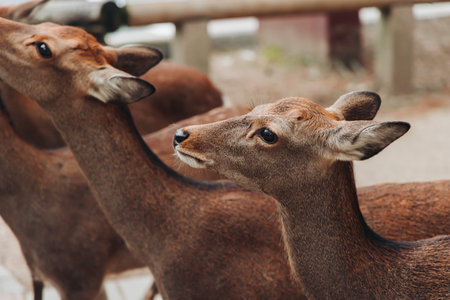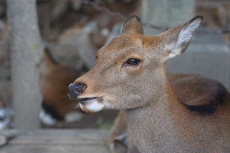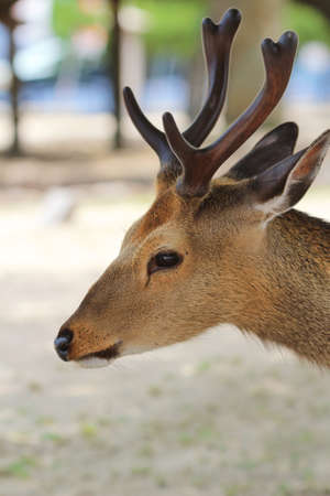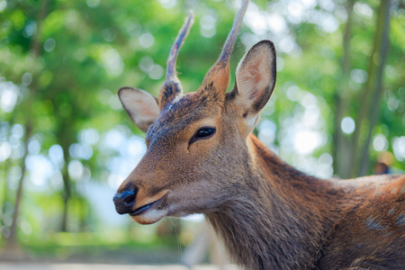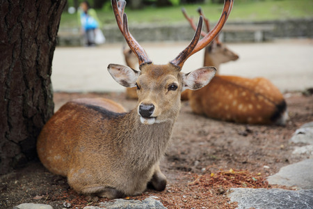 Wild sika deer living in Nara park, in city Nara, Honshu island former capital of Japan