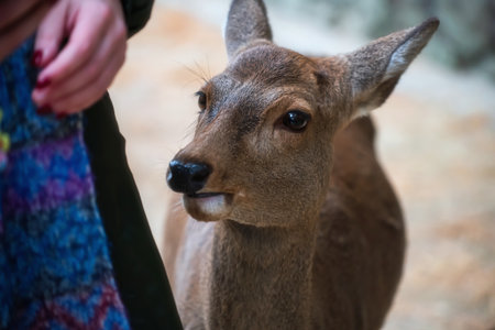 sika deer close to tourist people in Nara park, Japan. Famous travel destination for tour in Kansai to see deer at peak fall in December.