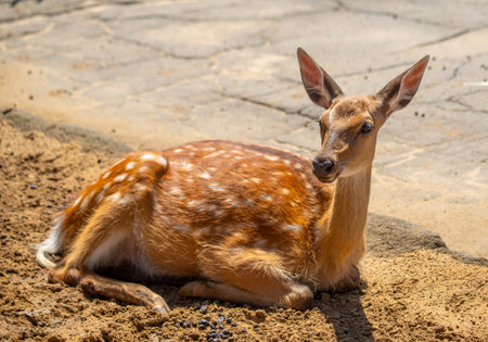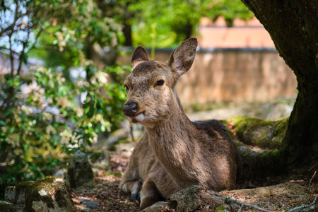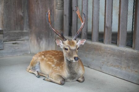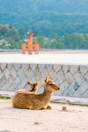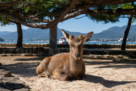 Japanese deer or Nihonjika lying in the shade in a park in Miyajima, Hiroshima, Japan.