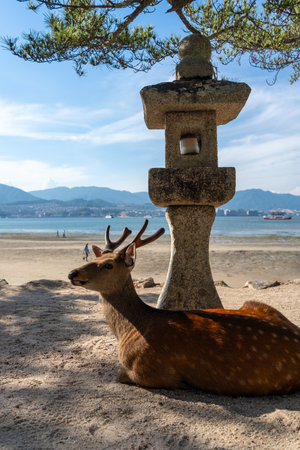 A peaceful deer lies in the shade beside a stone lantern, overlooking the sea on the tranquil beach of Miyajima, Japan