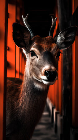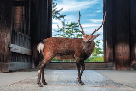 Sika deer stands at wooden temple gate in Nara, Japan, daytime