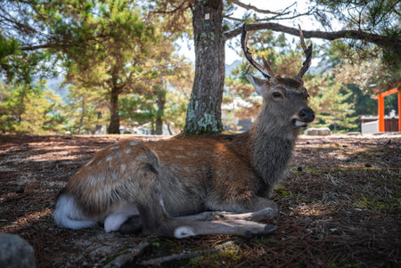 Sika deer rests under pines near orange torii at Itsukushima, Japan