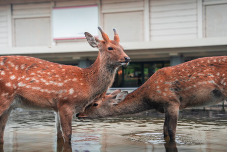 Sika deer wade at dusk near Nara National Museum in Nara Park