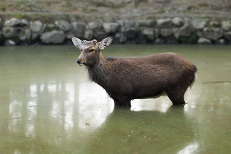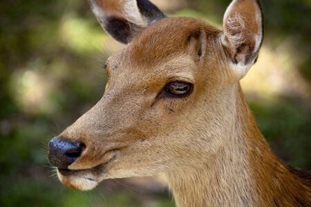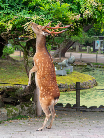Sika deer live freely in a Japanese Nara Park. A young wild Cervus nippon during spring season. Tourist attraction of Japan. Natural parks of the world.