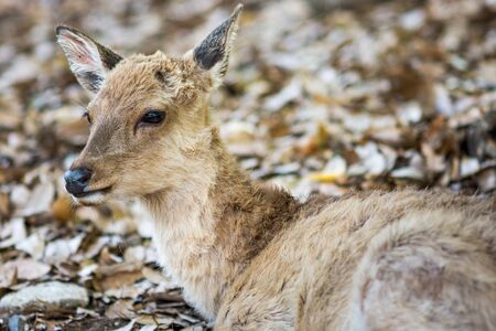 Closeup deer with antler laying down on the falling leaves floor at the park in Nara, Japan. The park is home to hundreds of freely roaming deer.