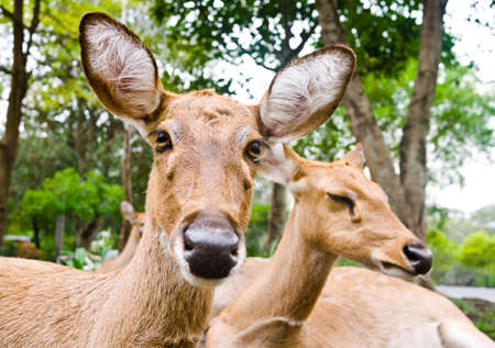 Close up shot of little fawn with deers background. Photo of young deer in wild green forest