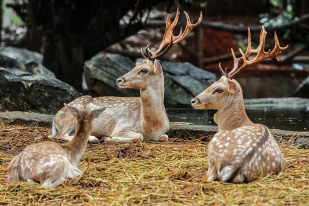 Three deer rest peacefully on the forest floor, their antlers visible amidst the natural surroundings.