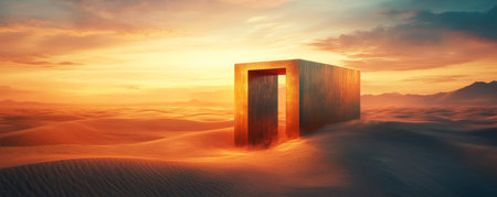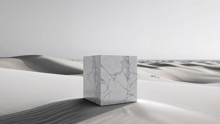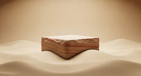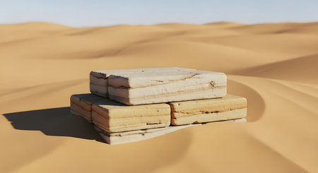Desert landscape with pedestal showcase ,sand and sky.Use for product presentation and banner.Generative AI