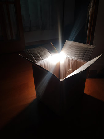 Open cardboard box on a wooden table with rays of light in the dark