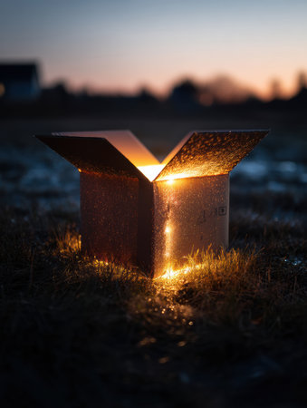A glowing open cardboard box sits on the grassy ground at dusk, casting a magical light that adds a sense of wonder and curiosity to the evening.