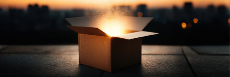 A cardboard box emits a warm, glowing light at dusk, casting an enchanting aura over the surrounding city skyline, creating a sense of wonder and curiosity.