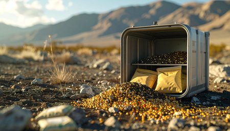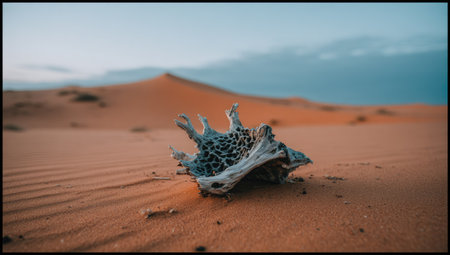 A weathered, skeletal object rests on a sandy surface, contrasted against a backdrop of rolling sand dunes. The image features warm tones of orange and brown, complemented by a soft blue sky. The composition utilizes natural lighting and may be suitable for illustrating concepts of resilience or environmental themes, suitable for various editorial purposes.