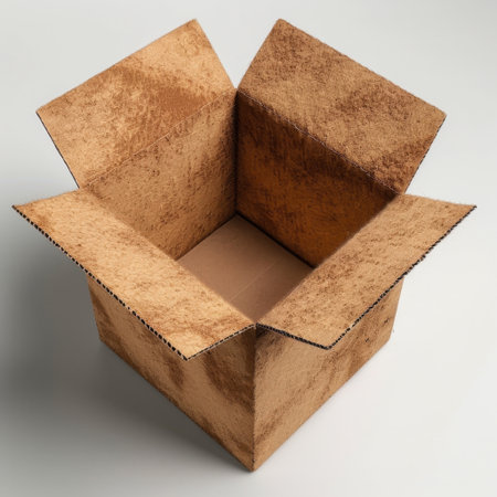 An open cardboard box rests on a bright white surface with soft shadows