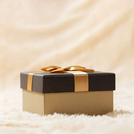 Beautiful golden box on a cream fur blanket. Surprises, gifts, bonuses, concept. Blank for advertising or design, copy space