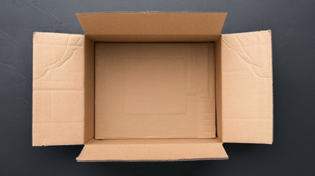 Opened empty cardboard parcel box on a dark background.