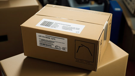 Shipping label attached to a cardboard box ready for delivery in a storage area