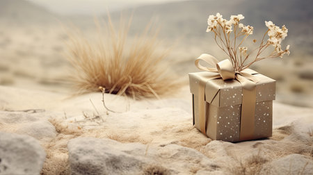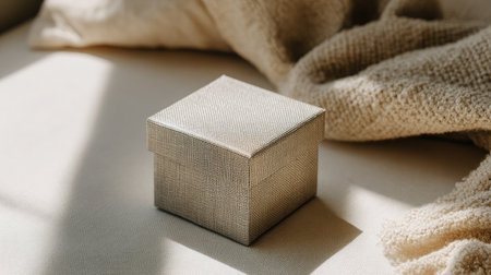 This elegant textured gift box is placed on a soft fabric surface, beautifully illuminated by natural light. The interplay of shadows adds depth to the composition.