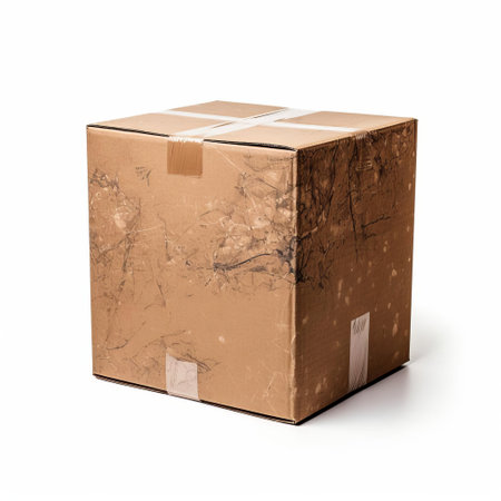 A plain brown cardboard box rests on a white surface, casting a distinct shadow. Clear details and vibrant col...