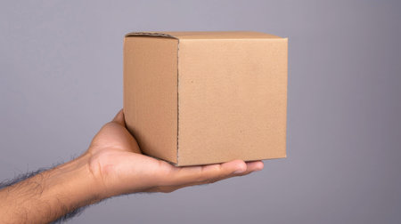 Side view of a couriers hands delivering a neatly packed cardboard box, emphasizing precision in parcel delivery.