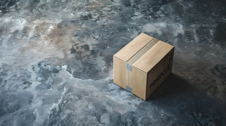 A plain brown cardboard box, sealed with clear tape, rests on a grey concrete floor against a simple backdrop. This isolated package symbolizes various concepts such as delivery, shipping, and e-comme