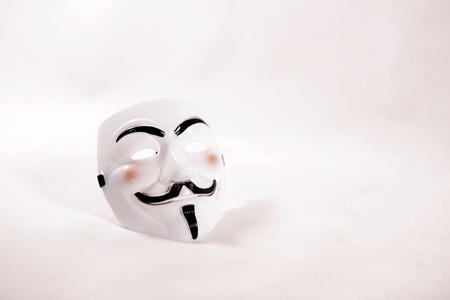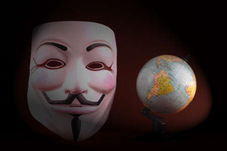 shot of an Anonymous face mask on the red background with globe, known as Guy Fawkes Mask from the movie V for Vendetta. Concept of anti-global movement