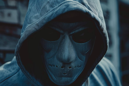 A person in a hooded sweatshirt stands still in a dark setting, their face revealed as a skull. The eerie atmosphere creates a sense of intrigue and mystery.