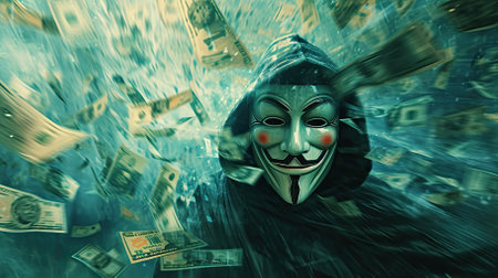 Abstract image of a textured face surrounded by dollar bills. This artwork symbolizes themes of greed, deception, and the pursuit of wealth, using a creative and thought-provoking design.
