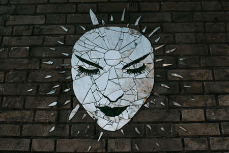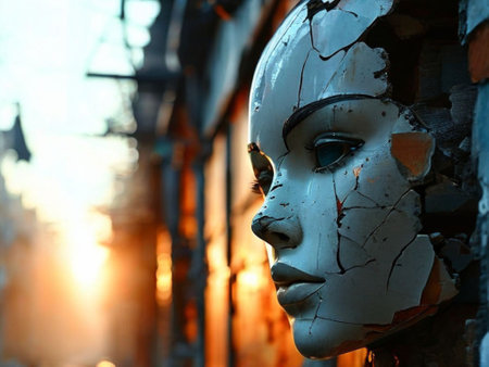 Detailed view of a cracked sculpture simulating a human face with a moody feel