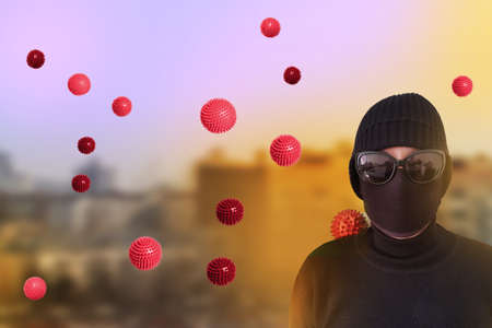 Young man in balcony wearing protective mask, sunglasses and hat with coronavirus particles around. Defocused city in sunset. Coronavirus CoVid stay home concept.