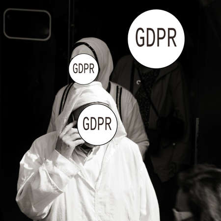 GDPR - an elderly man in Arabic clothes is talking on the phone, his face is covered with the inscription General Data Protection Regulation. Cyber security and privacy. Close-up