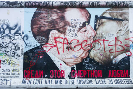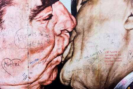 BERLIN, GERMANY, MARCH 12, 2015: leonid brezhnev kissing erich honecker on a painting situated in the east side gallery in berlin.