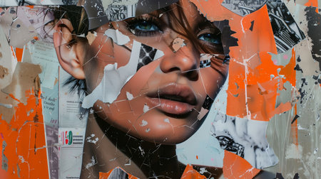 A close-up of a woman's face partially covered by a ripped poster on a weathered wall.