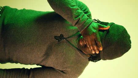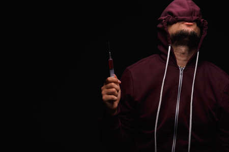 A drug user in a purple sweatshirt with a hood on his head suffers from drug addiction on a dark black background.