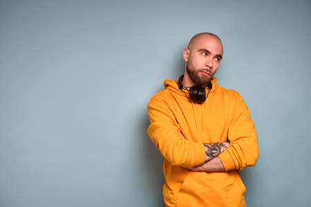 A bearded guy in a yellow sweatshirt stands with headphones on his neck with his arms crossed over his chest and rolled his eyes