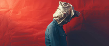 A person, wearing a blue shirt, stands against a red background with a crumpled paper bag over their head. The person is facing to the right of the frame and their head is bowed down. The paper bag covers most of the person's face.