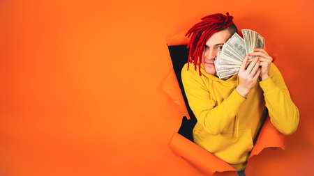 Young handsome man with money sticks out of hole of orange background. Stylish hipster with dollar bills