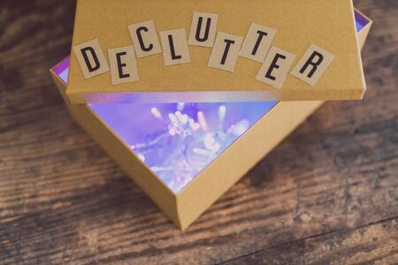 tidying up and sorting your possessions concept, declutter message on top of semi-open box to fill with items to give away (version with lights shining from inside the box)