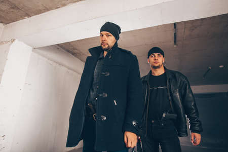 Dangerous burglars are standing in a dark hallway and wearing guns