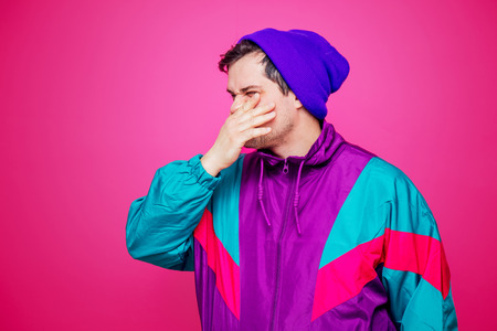 Style white man in 90s jacket and purple hat on purple-pink background