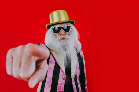 Fashionable grandfather posing with funny clothes. Senior man portraits on colored background