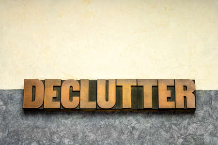 declutter word in vintage letterpress wood type against handmade textured amate paper, simplicity, minimalism and lifestyle concept
