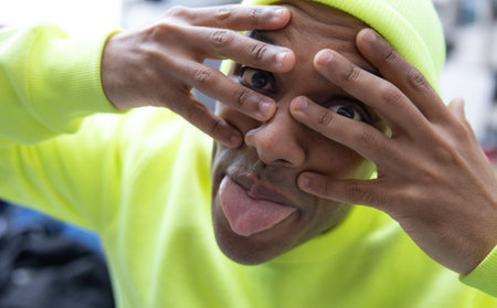 Cheerful man making funny face while covering eyes with hands in the city
