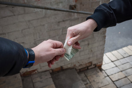 Hand of a drug addict with money, buys cocaine or heroin from a dealer. Drug sale concept.