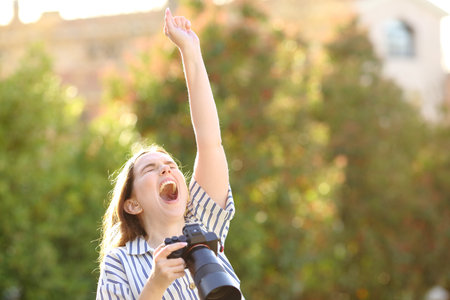 Overjoyed successful young woman celebrating win with raised arms, screaming with euphoria, happiness. Fortune concept
