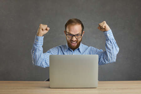 Yes, I did it. Happy euphoric ecstatic businessman in shirt and glasses sitting at table with laptop computer, celebrating success, fist pumping and shouting Hurray. Successful online business concept