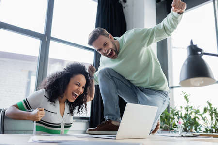 Excited man looking at laptop screen surprised by good online news. Happy male workers having fun chatting at office desk meeting.